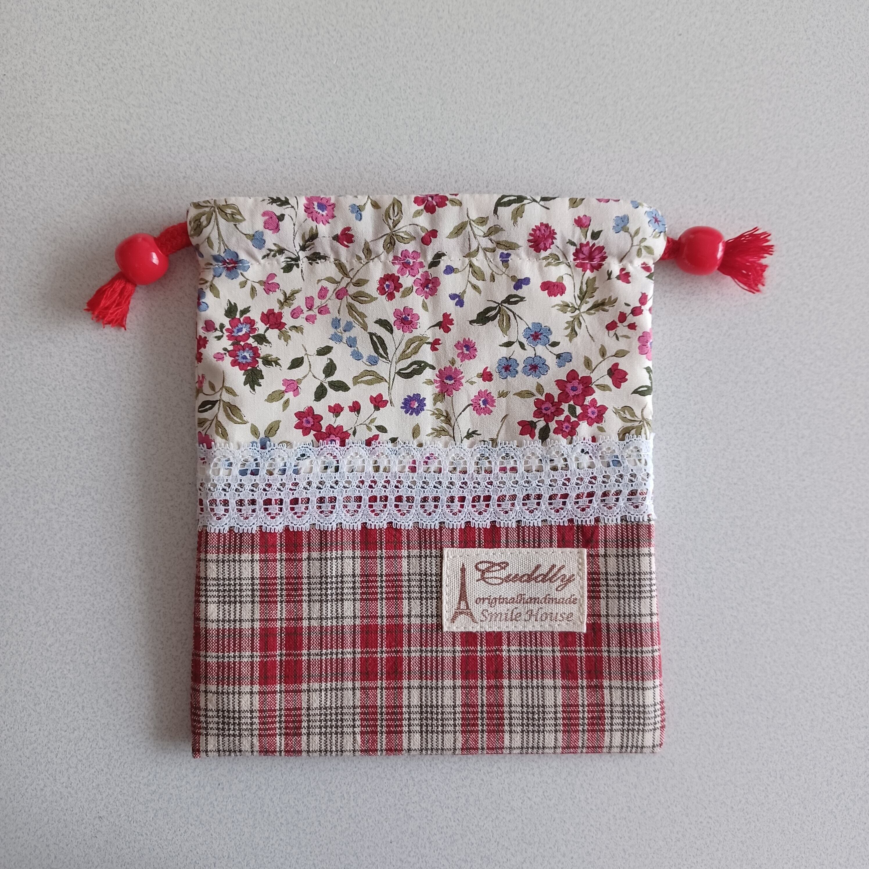 綿.ホワイトレースレッドお花柄&チェック巾着