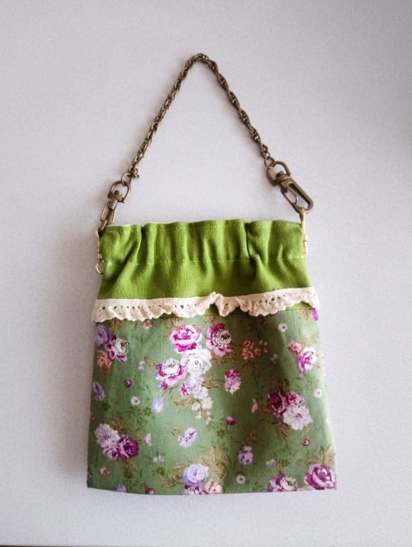 持ち手がついてアンティークグリーン花柄が可愛いです。
