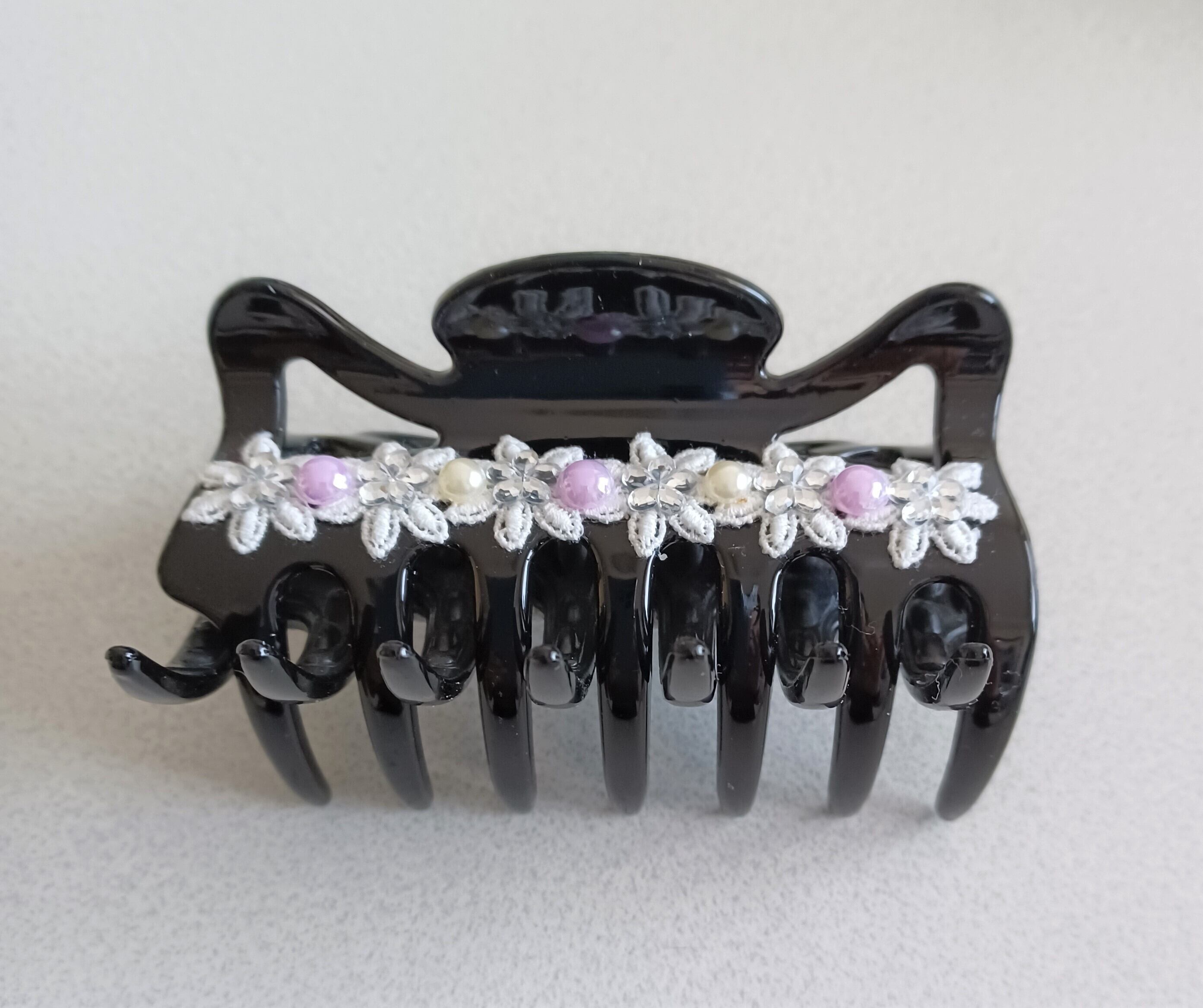 黒にお花ホワイトモチーフ、クリスタルデコ、パールパープルデコ