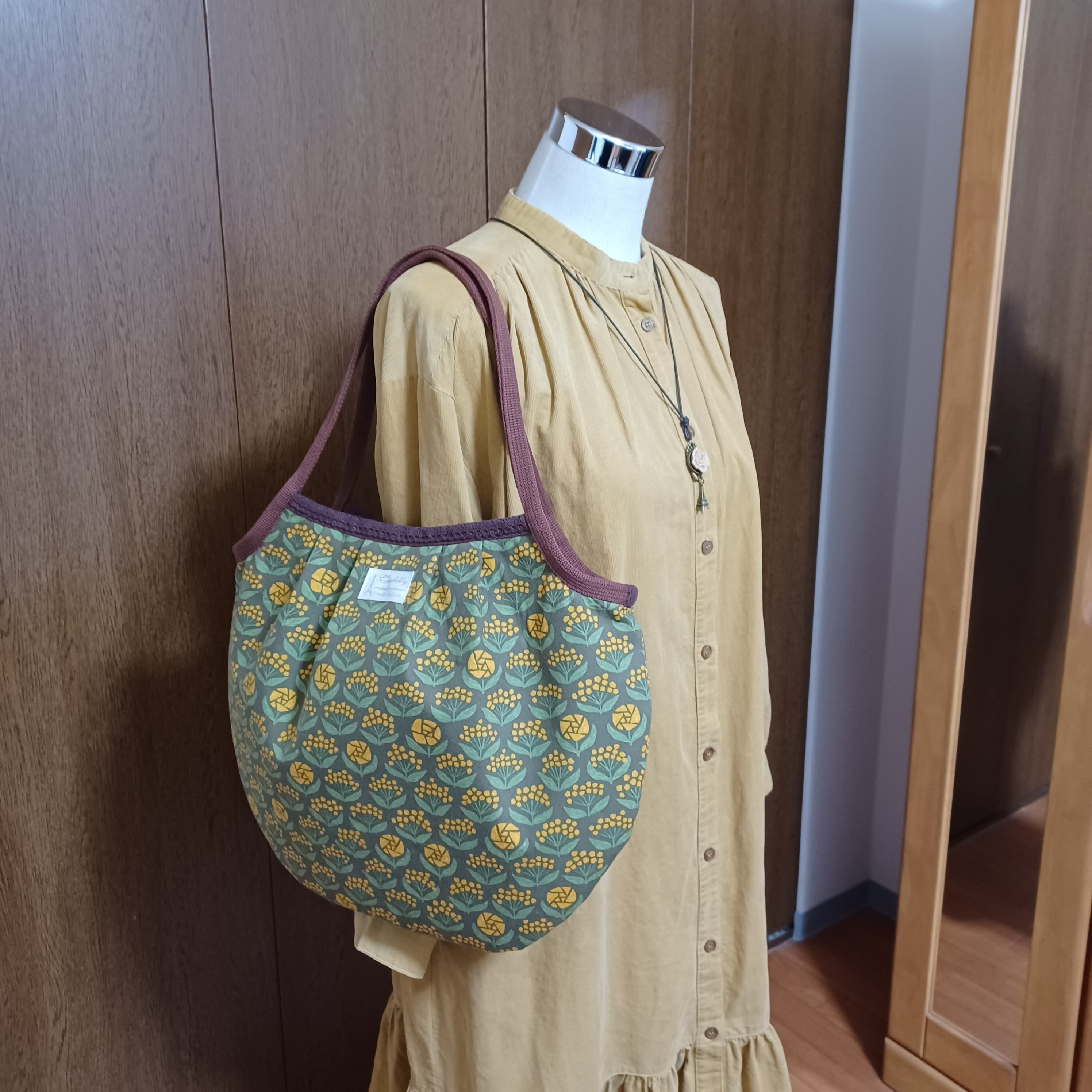 カーキ生地にミモザのお花が北欧柄で可愛いです。
