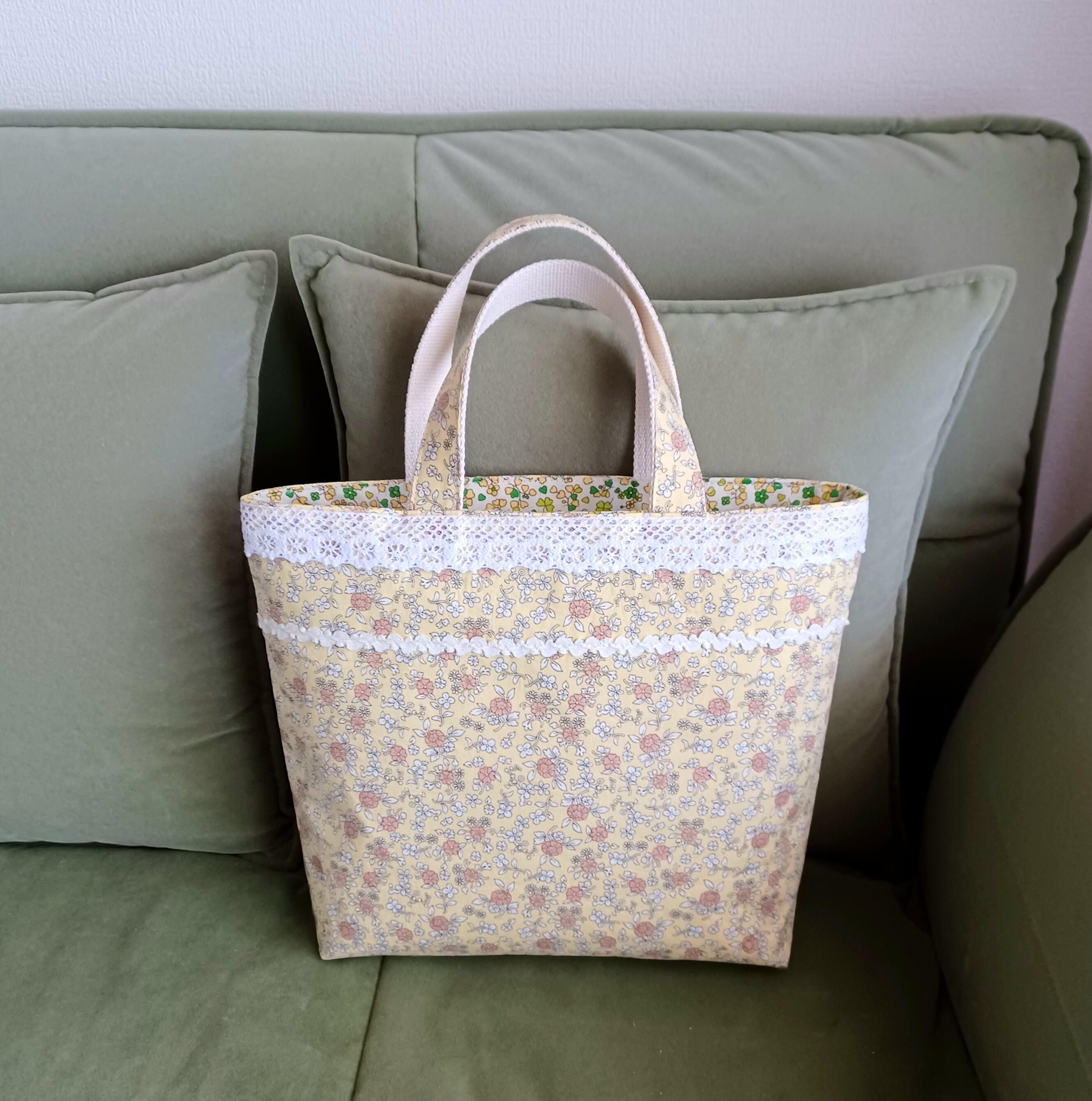 表:綿イエロー地にオレンジ花柄生地 中:綿クローバー柄生地